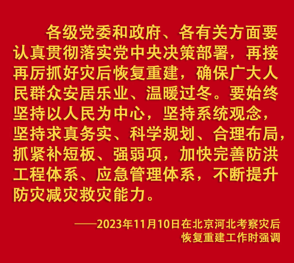 ??2023年汛期以來(lái),我國(guó)華北、東北等地出現(xiàn)極端降雨,引發(fā)洪澇和地質(zhì)災(zāi)害。習(xí)近平一直牽掛著受災(zāi)群眾,高度重視防汛抗洪救災(zāi)和災(zāi)后恢復(fù)重建工作,多次作出重要指示批示,要求有關(guān)地方和部門(mén)全力保障人民群眾生命財(cái)產(chǎn)安全,盡快恢復(fù)災(zāi)區(qū)正常生產(chǎn)生活秩序。2023年9月上旬,習(xí)近平前往黑龍江尚志市看望慰問(wèn)受災(zāi)群眾;11月,北方入冬之際,習(xí)近平又來(lái)到北京、河北受災(zāi)較重的相關(guān)地區(qū),看望慰問(wèn)受災(zāi)群眾,檢查指導(dǎo)災(zāi)后恢復(fù)重建工作。