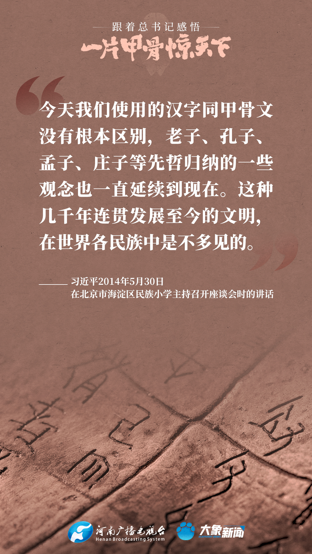 黨的十八大以來(lái),習(xí)近平總書(shū)記多次就殷墟和甲骨文保護(hù)研究利用工作作出重要講話重要指示,為我們堅(jiān)定文化自信,傳承發(fā)展中華優(yōu)秀傳統(tǒng)文化提供了根本遵循。大象新聞邀您一起回顧、學(xué)習(xí)。