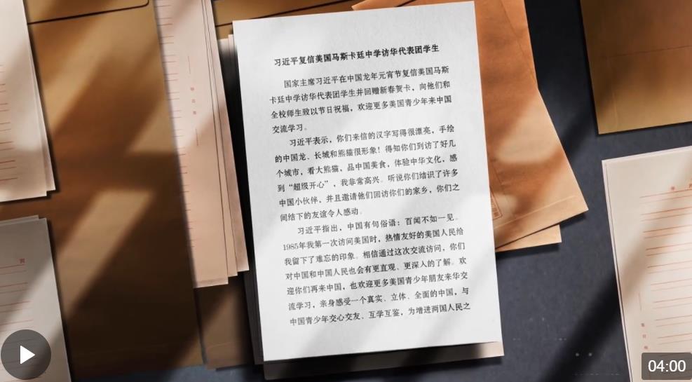 2023年11月,習近平主席訪美期間宣布,中方未來5年愿邀請5萬名美國青少年來華交流學習。美國艾奧瓦州友人薩拉·蘭蒂近期致信習主席,表示希望馬斯卡廷中學也參與這一計劃。