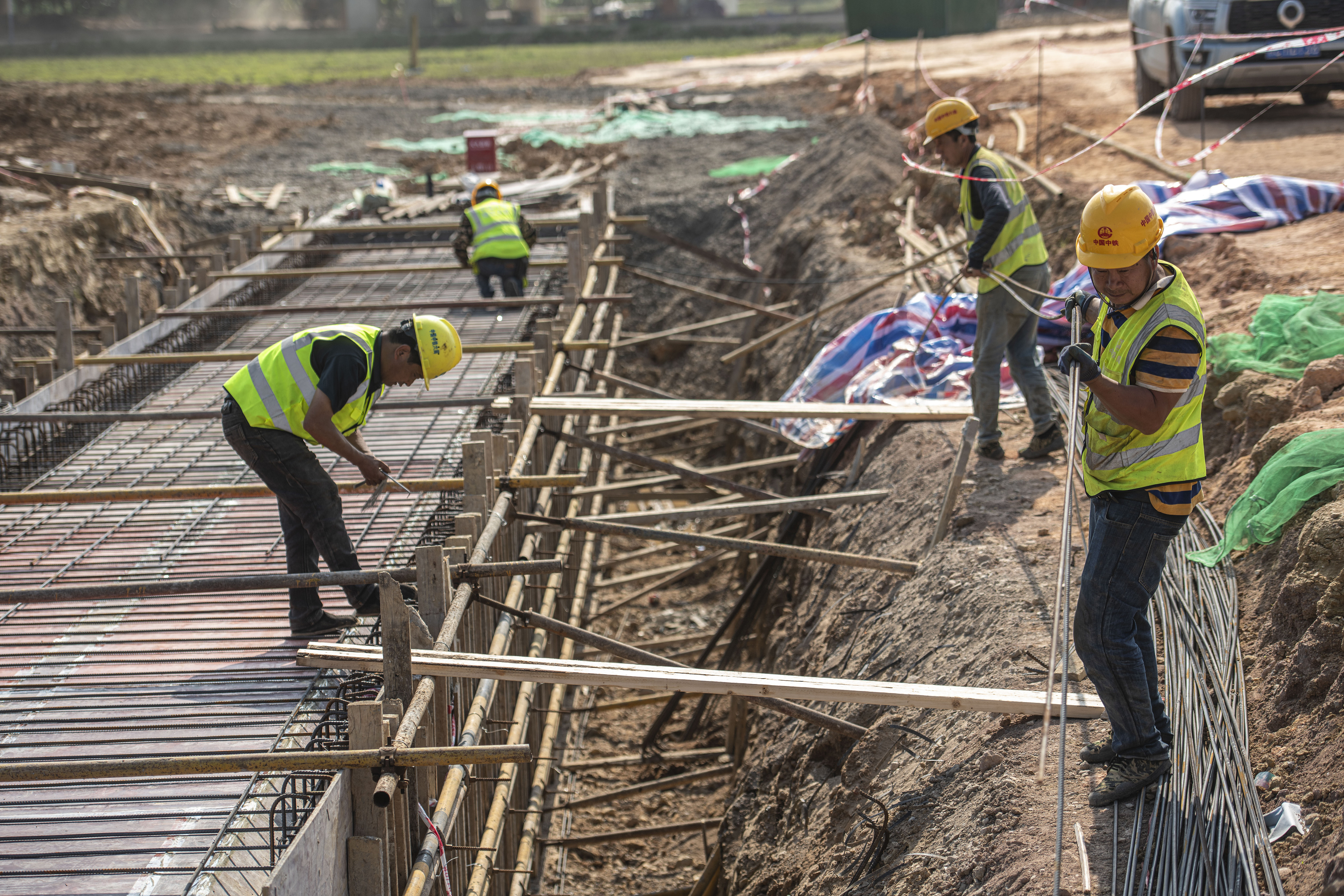 俯瞰陜西西安至延安高速鐵路渭河特大橋的建設(shè)現(xiàn)場,三百多名工人正在進行橋墩模板的加固作業(yè)。