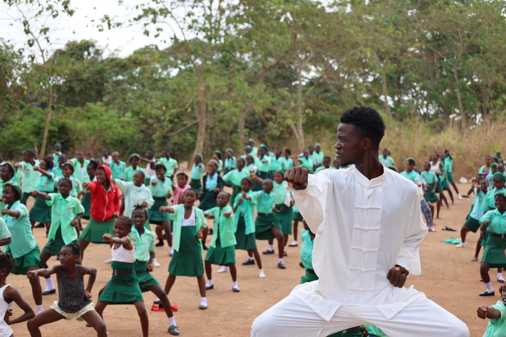 ??2月20日,在塞拉利昂首都弗里敦,來自塞拉利昂大學孔子學院的武術(shù)教師劉偉在為當?shù)貙W生上武術(shù)課。