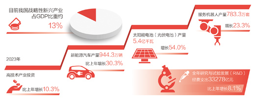 發(fā)展壯大戰(zhàn)略性新興產(chǎn)業(yè)?!皯?zhàn)略性新興產(chǎn)業(yè)具有創(chuàng)新活躍、技術(shù)密集等特點(diǎn),為新質(zhì)生產(chǎn)力發(fā)展壯大提供了巨大空間。”高文代表說(shuō),近年來(lái),我國(guó)戰(zhàn)略性新興產(chǎn)業(yè)蓬勃發(fā)展,目前戰(zhàn)略性新興產(chǎn)業(yè)占GDP比重約13%。