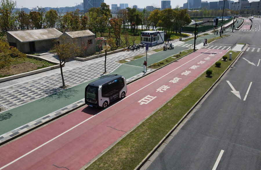??在中國(上海)自由貿(mào)易試驗(yàn)區(qū)臨港新片區(qū),一輛無人駕駛汽車行駛在自動(dòng)駕駛測(cè)試專用路上(無人機(jī)照片,2024年4月9日攝)。