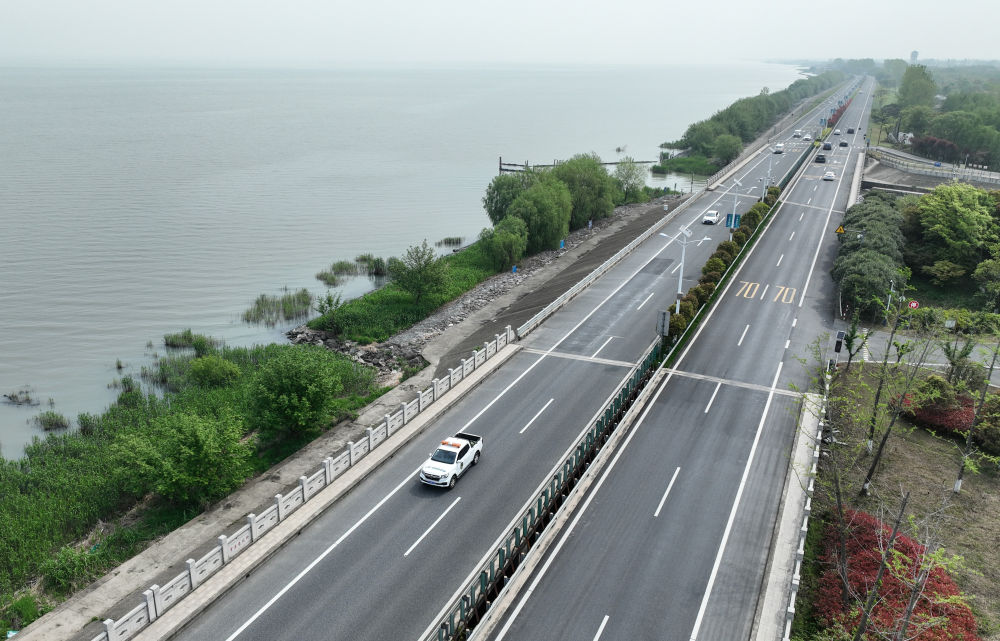 ??2024年4月11日,浙江省湖州市吳興區(qū)綜合行政執(zhí)法局高新區(qū)中隊執(zhí)法人員駕車在太湖沿岸巡查(無人機照片)。