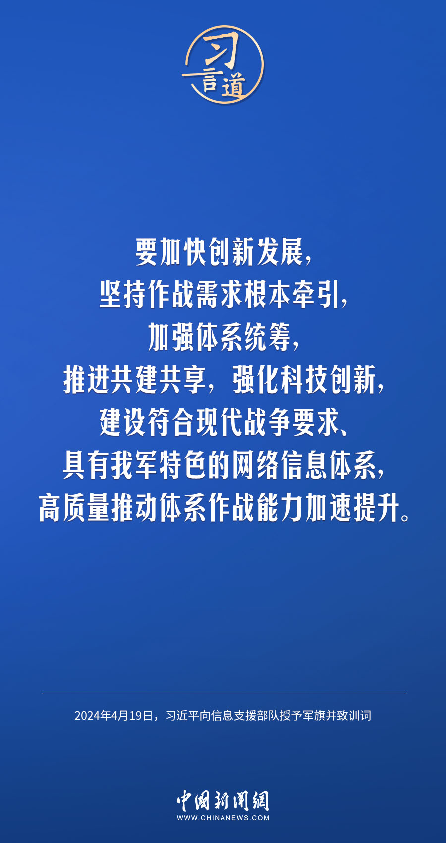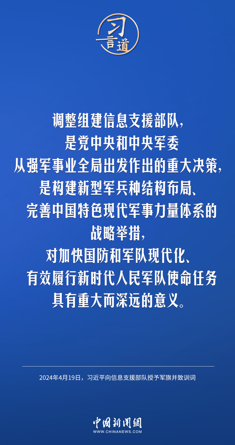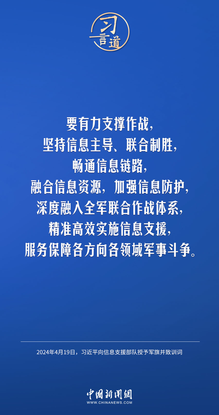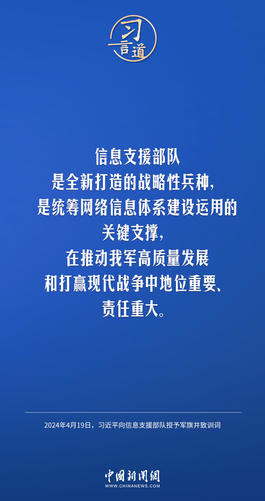 中國人民解放軍信息支援部隊成立大會19日在北京八一大樓隆重舉行。中共中央總書記、國家主席、中央軍委主席習(xí)近平向信息支援部隊授予軍旗并致訓(xùn)詞,代表黨中央和中央軍委向信息支援部隊全體官兵致以熱烈祝賀。他強調(diào)——