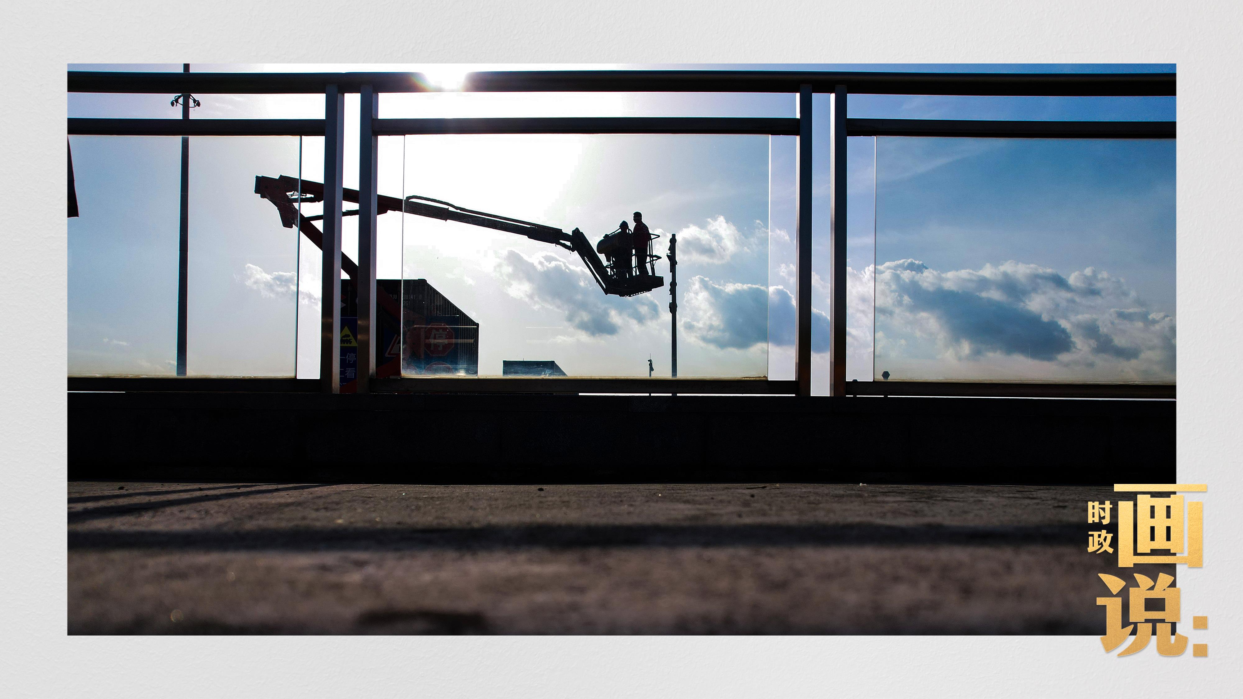 △搭乘機(jī)械臂的工作人員正在升空作業(yè)。