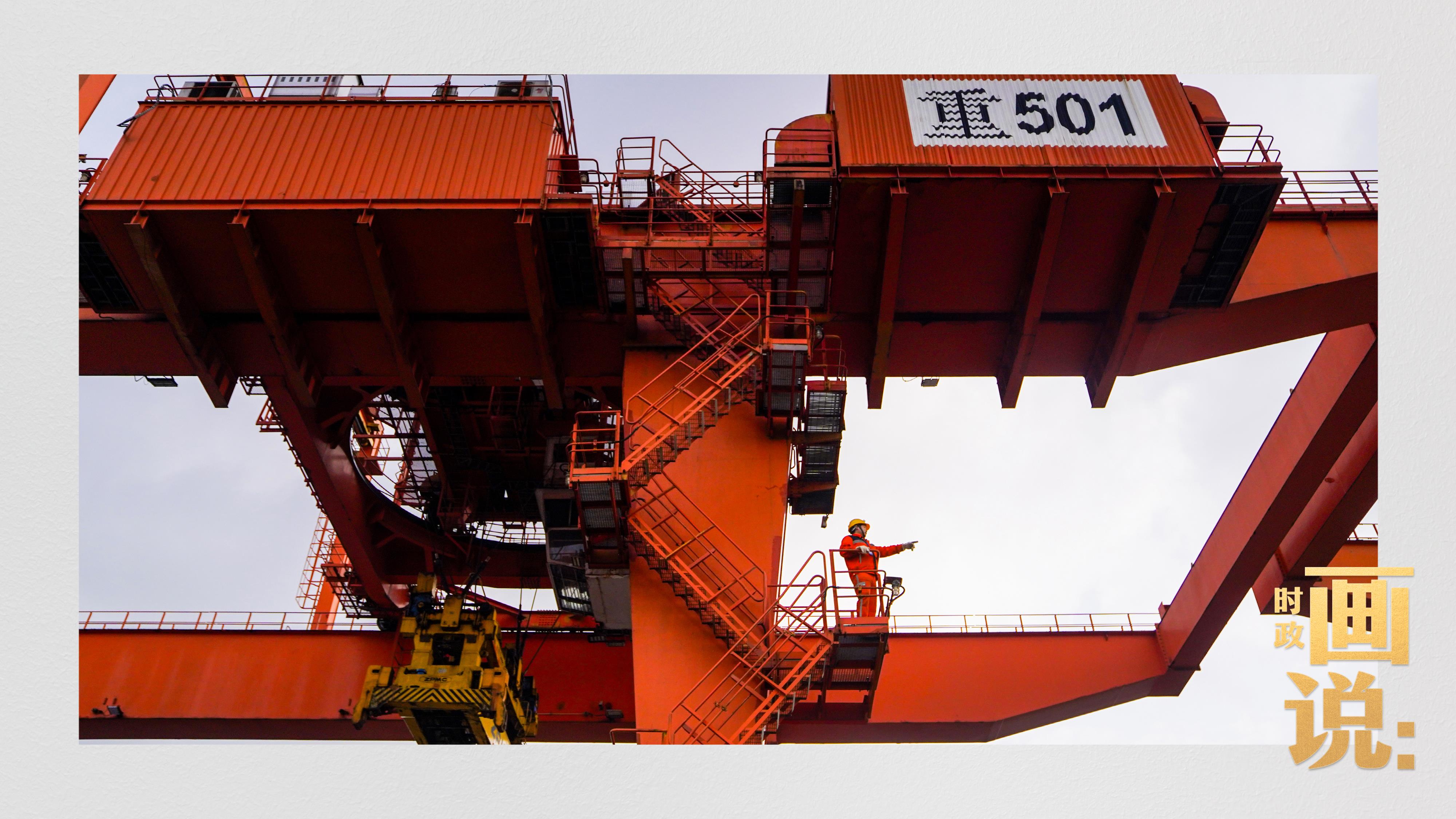 △果園港沿江碼頭平臺(tái)上,大型岸橋正在向滾裝輪上裝載貨柜。兩江新區(qū),重慶。