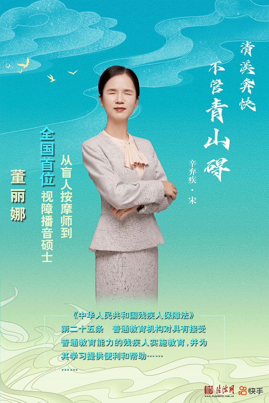 董麗娜先天弱視,10歲失明。但她自強不息、排除萬難,在22歲時爭取到視障人士播音培訓機會,獲得一級甲等普通話證書,成為《麗娜品讀時間》的主持人。2020年考入中國傳媒大學攻讀碩士學位,2023年畢業(yè)成為全國首位視障播音碩士。