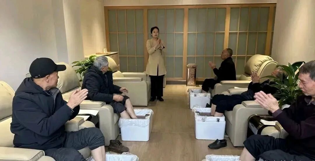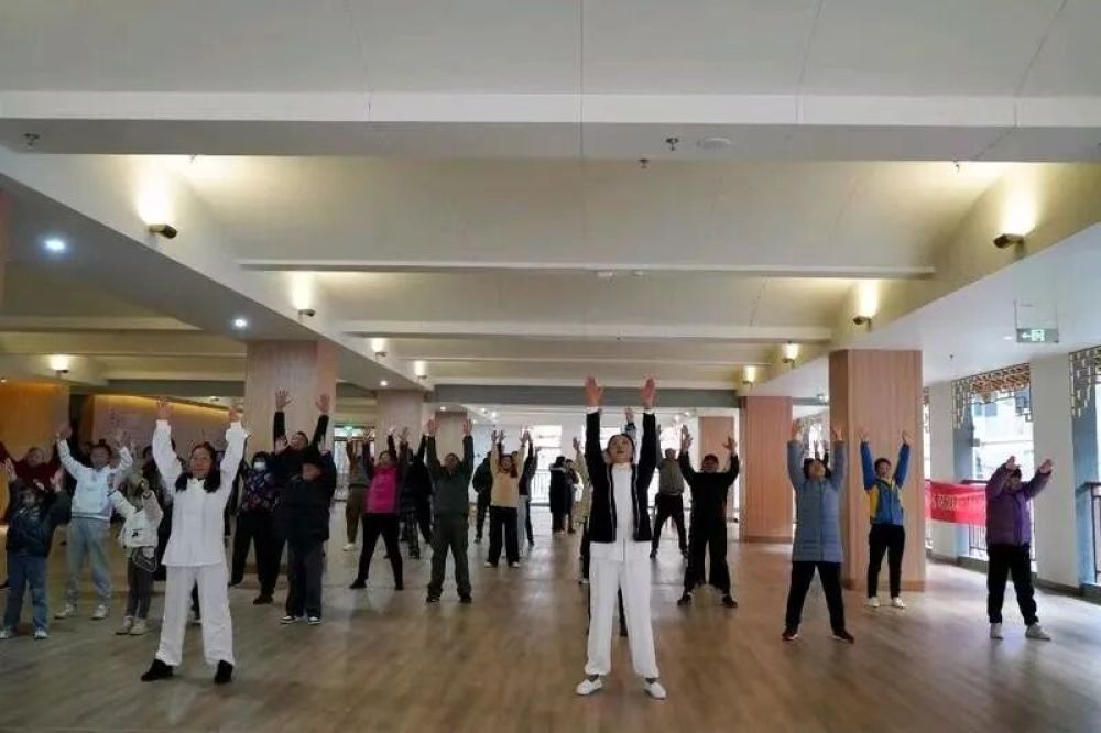 幾位銀發(fā)老人正跟著健康管理師舒展肢體