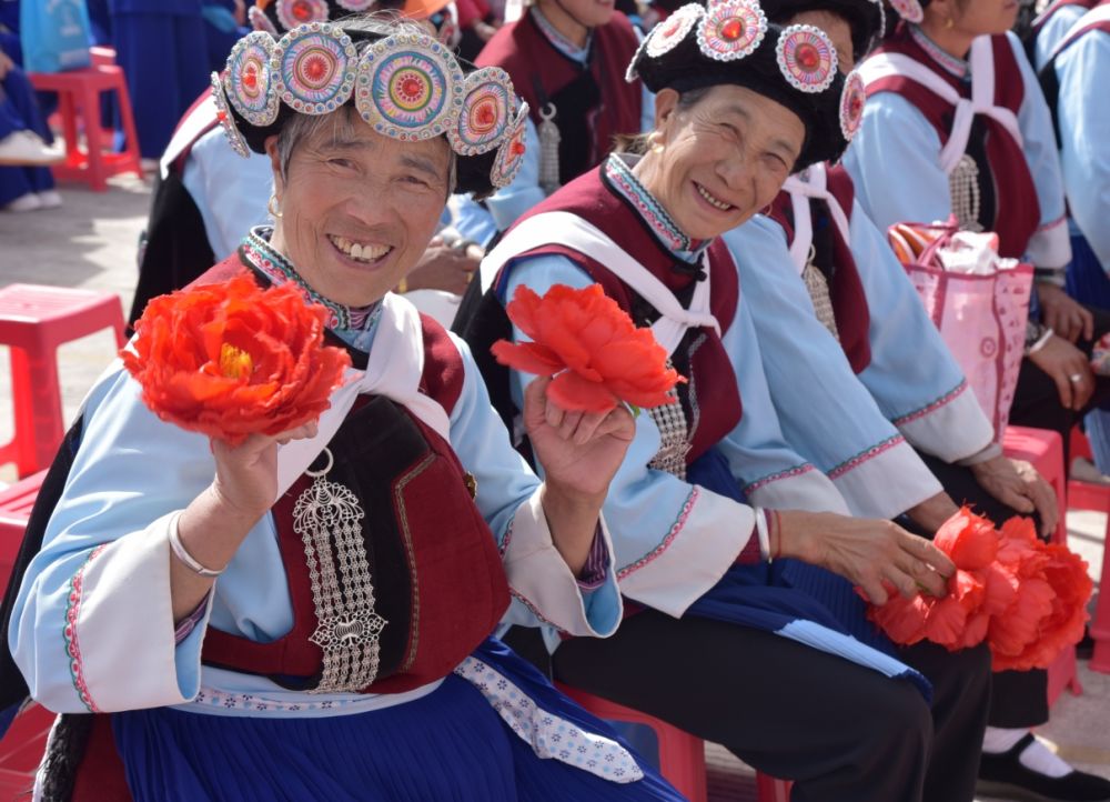 活動現(xiàn)場,老人們手拿表演用的花朵,臉上綻放著幸福的笑容。(麗江融媒記者 段玉菊 攝)