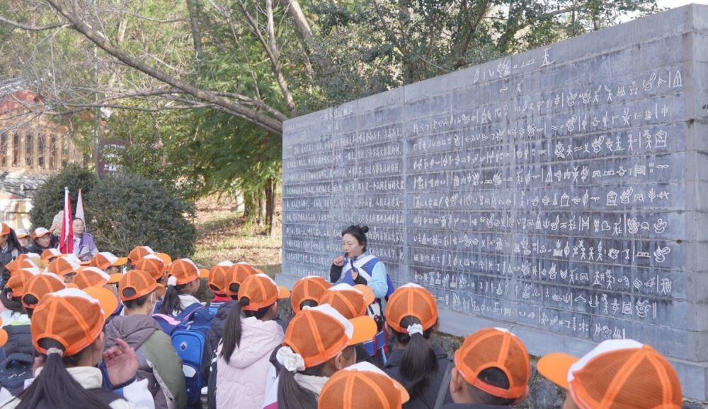 在“一滴水經(jīng)過麗江”研學點,學生們嘗試將課文內容與東巴象形文字相對照,從文字、文化到自然景觀,完成一場跨學科的認知理解與知識延展。