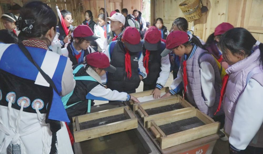 在民俗院落里,文化不再是書本上抽象的概念,而是具象鮮活的納西族生活圖景?;鹛僚?,研學導師講述火塘在納西族生活中兼具取暖、炊煮、議事、傳承家風的核心地位;釀酒坊中,酒香氤氳間,學生們了解到納西族傳統(tǒng)釀造工藝背后的民俗內涵與文化寓意;造紙坊里,一張張東巴紙從原料到成品的過程,讓孩子們真切感悟到納西先民順應自然、敬畏自然的生存智慧。