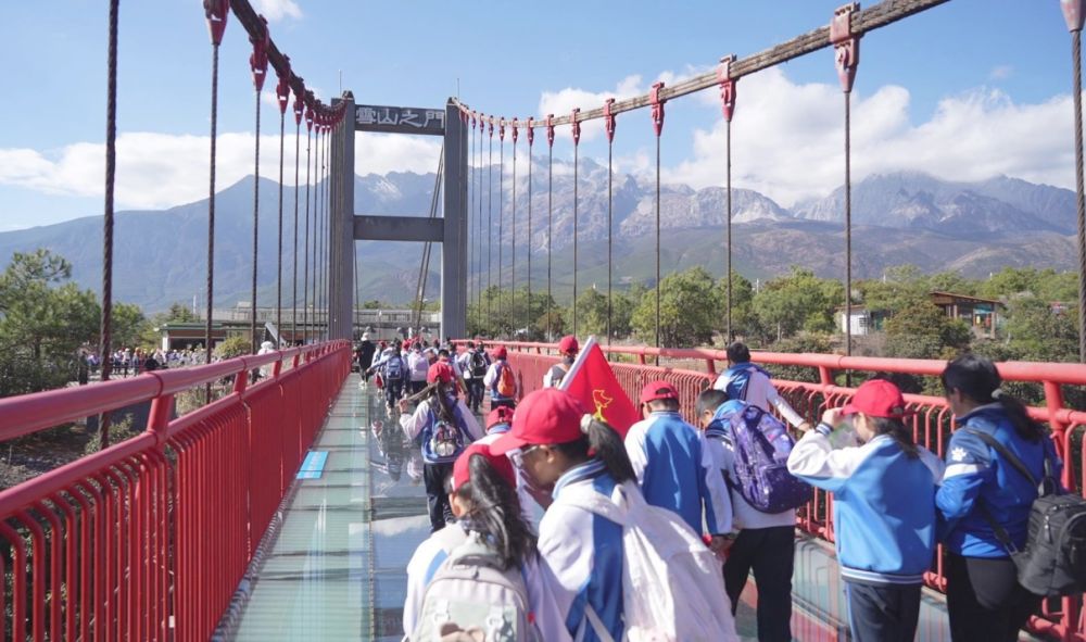 在老師與工作人員的引導下,學生們有序體驗高空玻璃橋。腳下是峽谷深壑,遠處是雪山云海。這不僅是一次勇氣的挑戰(zhàn),也是一堂融合工程結構、自然地形與心理素質的實踐課程。