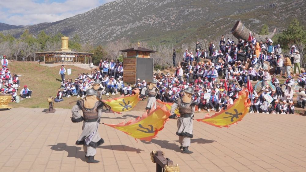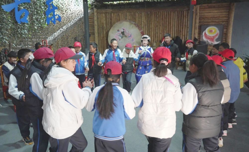 在老師的帶領下,學生們參與納西族傳統(tǒng)打跳,歡笑聲不斷。
