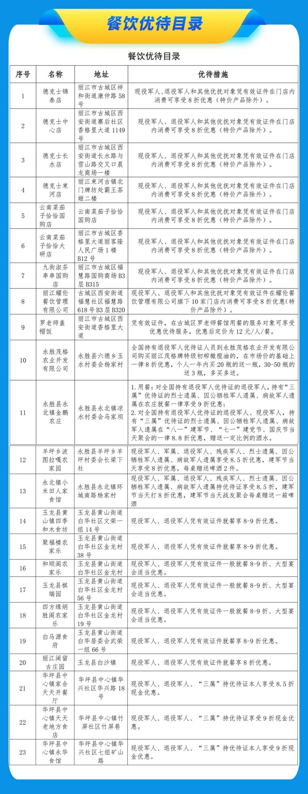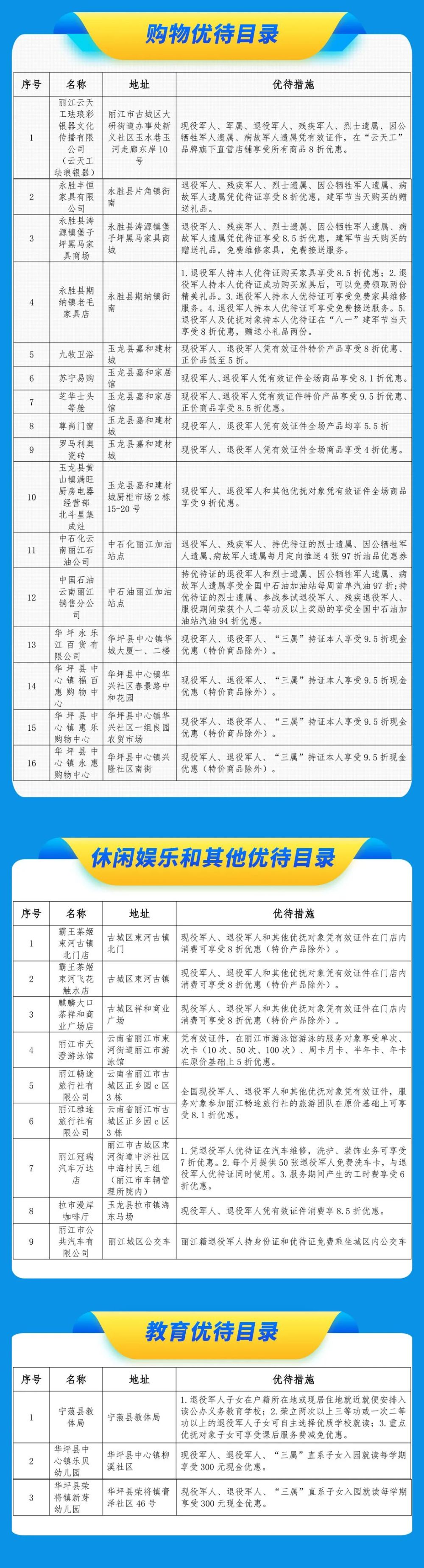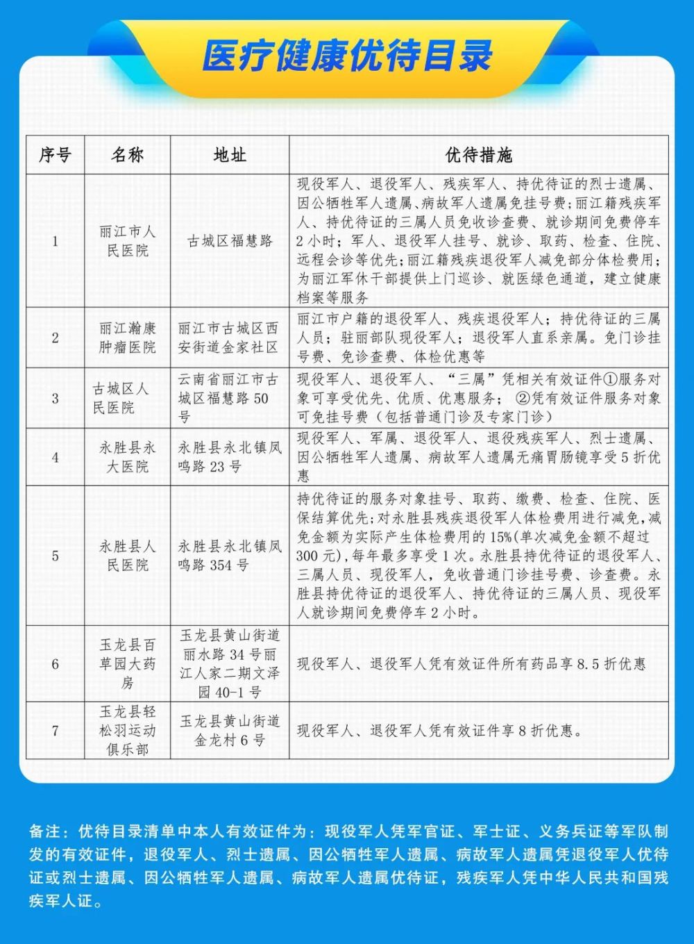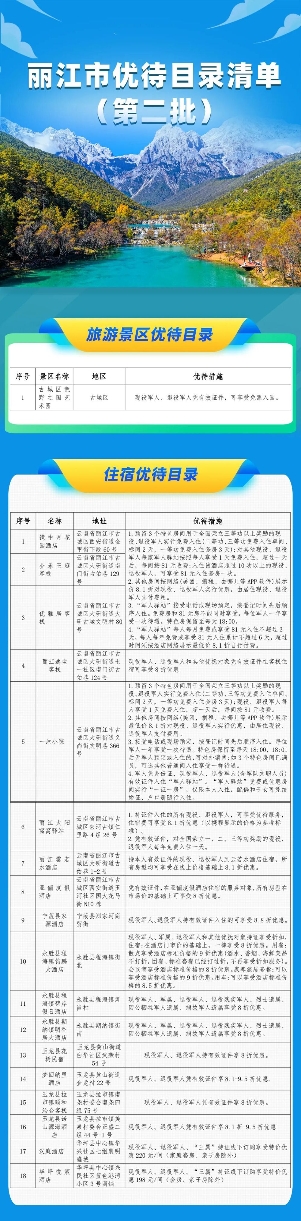為深入貫徹落實(shí)習(xí)近平新時(shí)代中國(guó)特色社會(huì)主義思想和習(xí)近平總書記關(guān)于退役軍人工作的重要論述,進(jìn)一步弘揚(yáng)擁軍優(yōu)屬、擁政愛(ài)民的光榮傳統(tǒng),麗江市持續(xù)提升服務(wù)保障水平,致力打造“舍不得的麗江·忘不了的尊崇”擁軍品牌,在全社會(huì)的共同參與下,2025年新增77項(xiàng)優(yōu)待事項(xiàng),現(xiàn)予以公布,請(qǐng)廣大現(xiàn)役軍人、退役軍人和“三屬”朋友關(guān)注,并憑本人有效證件享受相應(yīng)優(yōu)待。