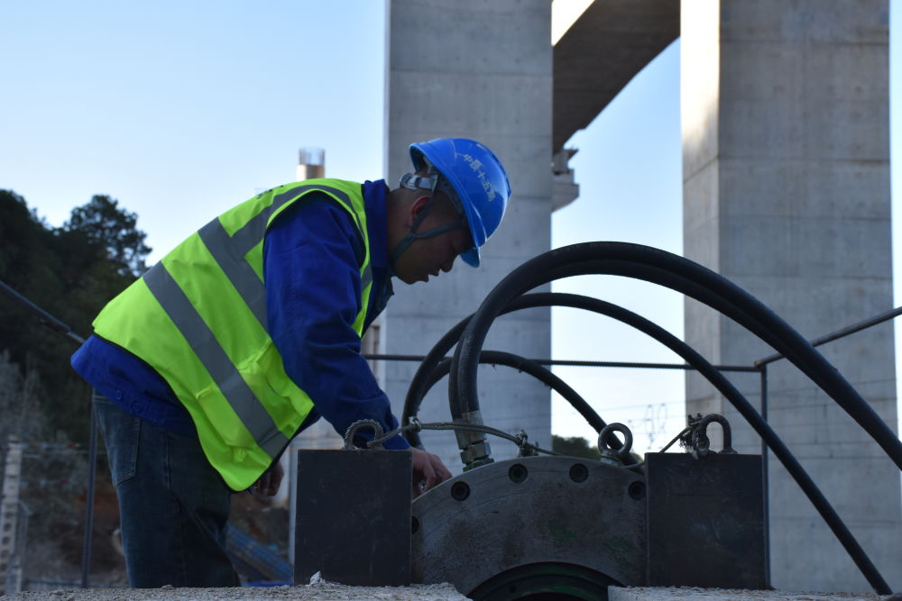 施工人員操作液壓千斤頂。(麗江融媒記者 楊四娟 攝)