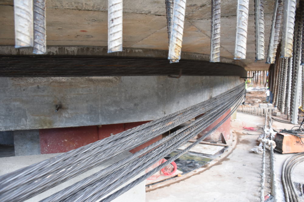 “施工過程中,技術(shù)人員先在遠離鐵路線的安全區(qū)域,通過掛籃懸臂法澆筑梁體,待主體結(jié)構(gòu)完工后,再借助球鉸轉(zhuǎn)動系統(tǒng),牽引梁體轉(zhuǎn)體跨越鐵路。這個轉(zhuǎn)體看著簡單,實則步步驚心?!?黃偉坦言,大橋地處曲線段,施工場地狹窄,與鐵路交叉角度小,樁基距鐵路中心線最小距離僅7.01米,施工難度和安全風(fēng)險都極高,歷經(jīng)14個月完成橋梁主體工程建設(shè)。球鉸轉(zhuǎn)動系統(tǒng)是橋梁轉(zhuǎn)體的“旋轉(zhuǎn)底盤”,由上下兩個球面部件組成,既能穩(wěn)穩(wěn)托住幾千噸重的橋體,又能順著預(yù)定方向,讓橋體精準、平穩(wěn)地轉(zhuǎn)到指定位置。