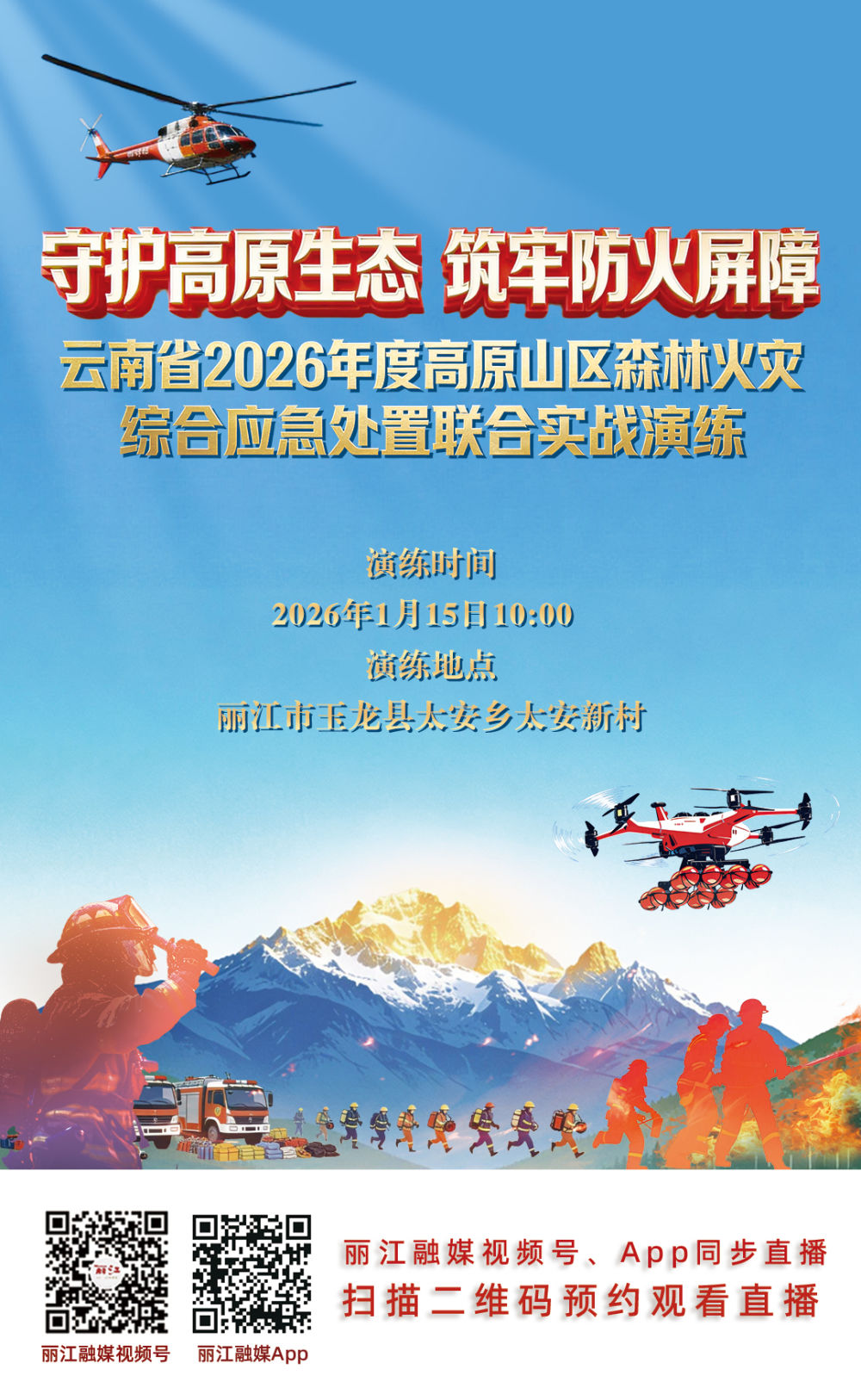 云南省森林草原防滅火指揮部擬于2026年1月15日10:00—12:00,在麗江市玉龍縣太安鄉(xiāng)太安新村開展“守護(hù)高原生態(tài) 筑牢防火屏障——云南省2026年度高原山區(qū)森林火災(zāi)綜合應(yīng)急處置聯(lián)合實(shí)戰(zhàn)演練”。麗江市融媒體中心將通過(guò)“麗江融媒”視頻號(hào)、App同步直播。