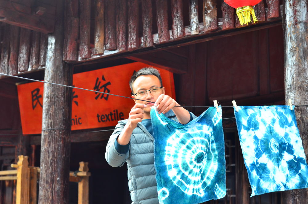 游客在東巴谷景區(qū)體驗扎染。(景區(qū)供圖)