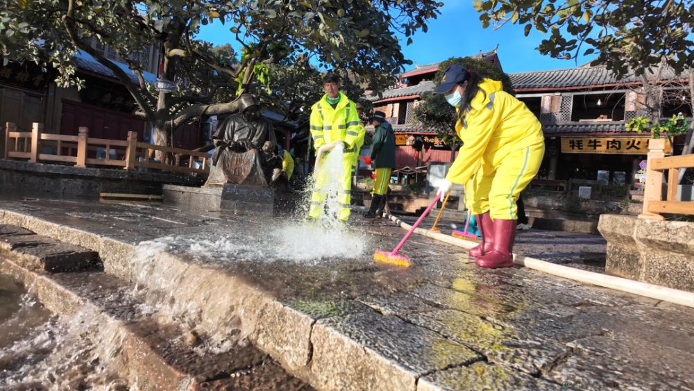 清晨九點(diǎn),隨著四方街“四龍戲水”旁的水閘緩緩開(kāi)啟,源自玉龍雪山的清水自流而下,漫過(guò)青石板街道。身著黃色工作服、腳穿防滑雨鞋的工作人員分成多個(gè)工作組,沿玉河廣場(chǎng)、東大街、四方街、新華街、官門口、木府等區(qū)域同步作業(yè)。臨近河道的街巷直接引活水沖刷,偏遠(yuǎn)小巷則啟用抽水泵加壓清洗,大家手持掃帚、刷子默契配合,重點(diǎn)清理路面縫隙污漬與角落積塵。流水所到之處,原本略帶塵跡的五花石路面被沖刷得光潔如新,石紋在暖陽(yáng)下清晰可見(jiàn),古城街巷煥發(fā)清新活力。