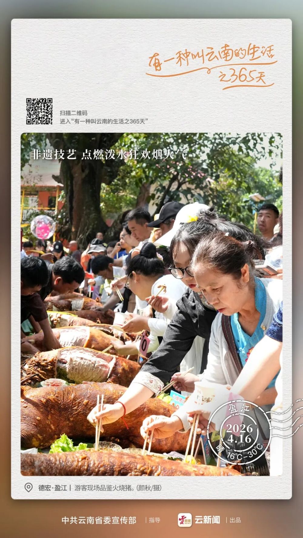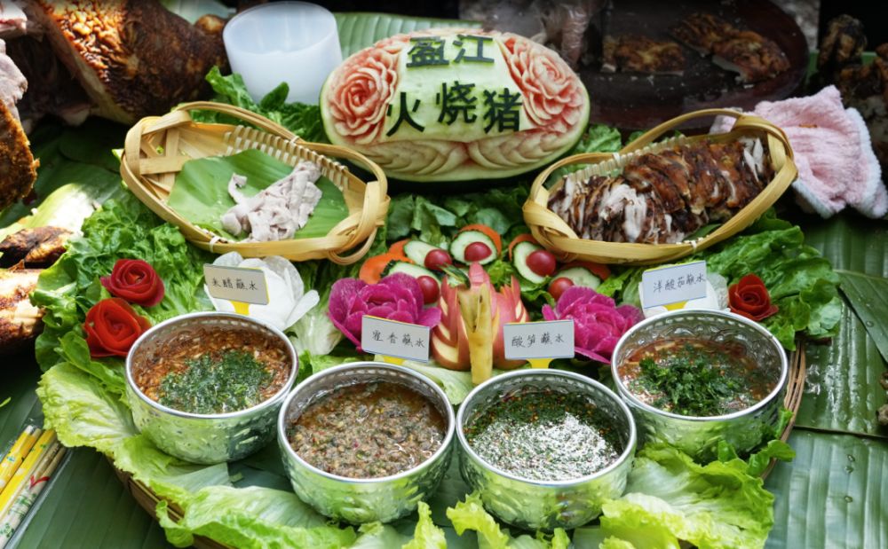 若您恰逢此時(shí)來到云南盈江,不妨循著煙火氣找到傣家人的烤架旁??粗瘘S酥脆的火燒豬被利刀切開,油花順著焦香的外皮滑落,那是獨(dú)屬于盈江南亞熱帶季風(fēng)氣候里的鮮活滋味,也是傣家人刻在骨子里的煙火日常。