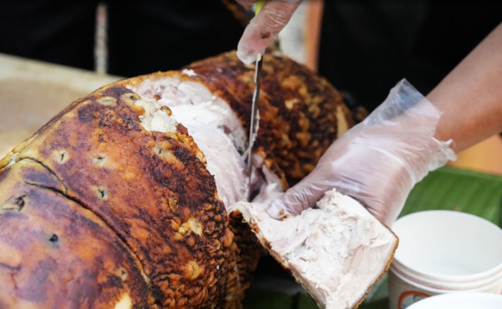 本地品種的小耳豬,清理后在其腹腔塞入緬桃葉、香茅草等天然香料,再裹上特制的灶灰泥,經(jīng)數(shù)小時(shí)慢火烘烤方可出爐。
