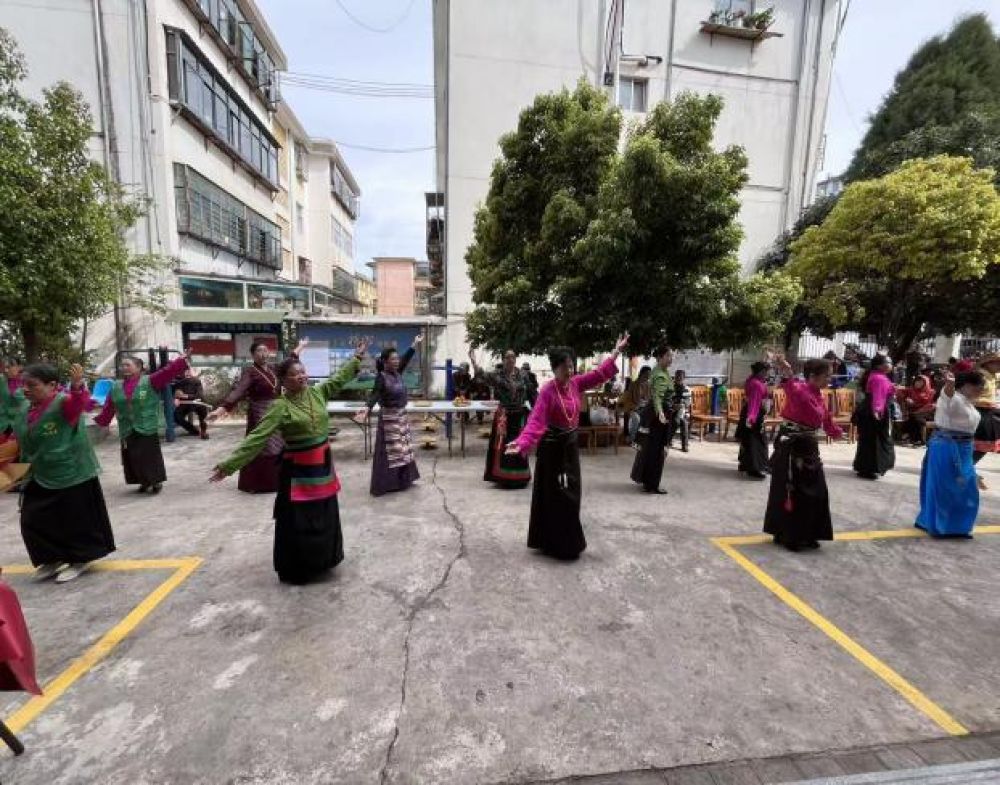 寨鑫社區(qū)居民在幸福食堂前載歌載舞。(寨鑫社區(qū) 供圖)