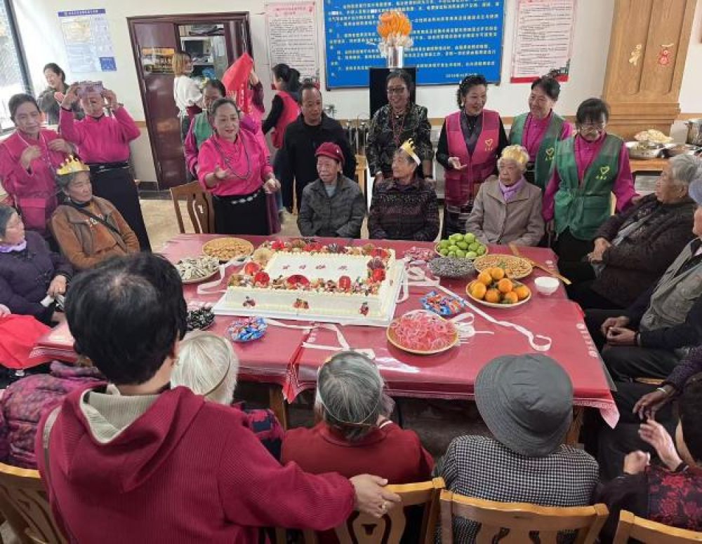 社區(qū)工作人員在幸福食堂為老人過生日會(huì)。(寨鑫社區(qū) 供圖)