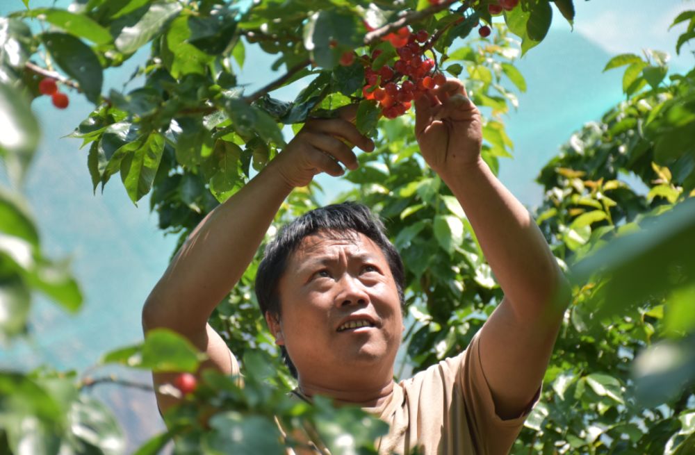 東風(fēng)居民小組櫻桃種植戶王松在采收櫻桃。(麗江融媒記者 楊四娟 攝)