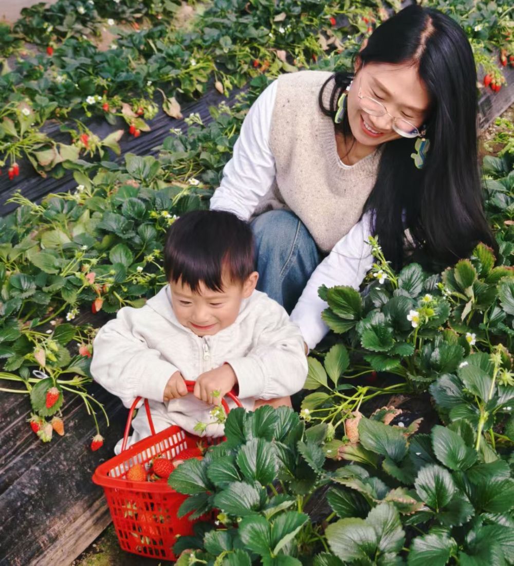 劉云燕帶孩子體驗草莓采摘。(劉云燕 供圖)