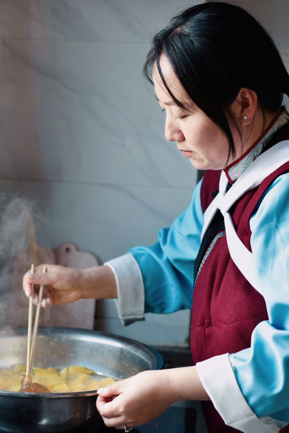進(jìn)入熬煮階段,外婆耐心地觀察糖色變化。(麗江融媒記者 李琳瑛 攝)