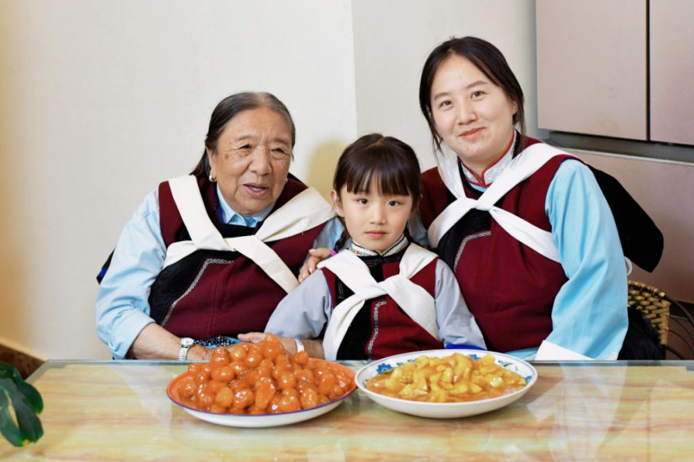 蜜餞熬煮好后,祖孫三代人正在裝盤。(麗江融媒記者 李琳瑛 攝)