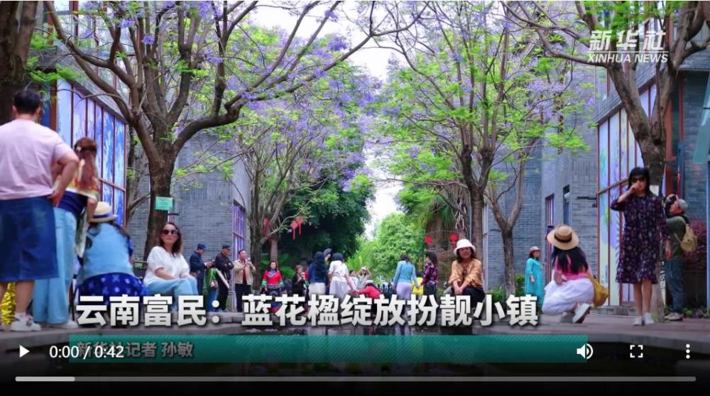 這幾天,云南省富民縣上河院文創(chuàng)旅游小鎮(zhèn)內(nèi),藍(lán)花楹正值盛花期。青磚黛瓦間,藍(lán)紫色花朵綴滿枝頭,與白族風(fēng)格建筑相映成趣。不少市民游客駐足賞花、拍照,享受愜意時(shí)光。