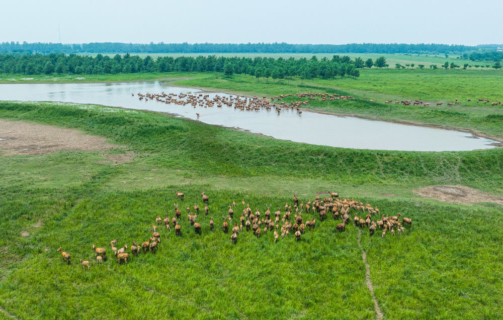 2023年5月19日,麋鹿在湖北石首麋鹿國家級自然保護(hù)區(qū)內(nèi)活動(無人機(jī)照片)。伴隨生態(tài)環(huán)境改善,在湖北石首麋鹿國家級自然保護(hù)區(qū)、神農(nóng)架林區(qū)等多個(gè)生態(tài)屏障區(qū),麋鹿、金絲猴等野生動物種群數(shù)量大幅增長。