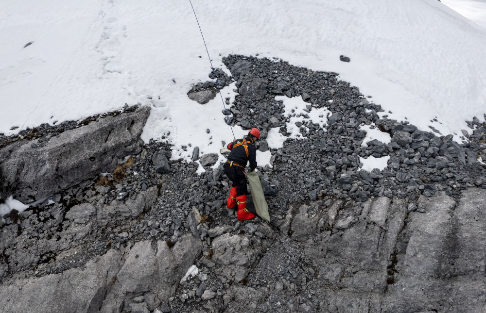 3月26日,呂皓葳在玉龍雪山崖壁上撿拾氧氣瓶。