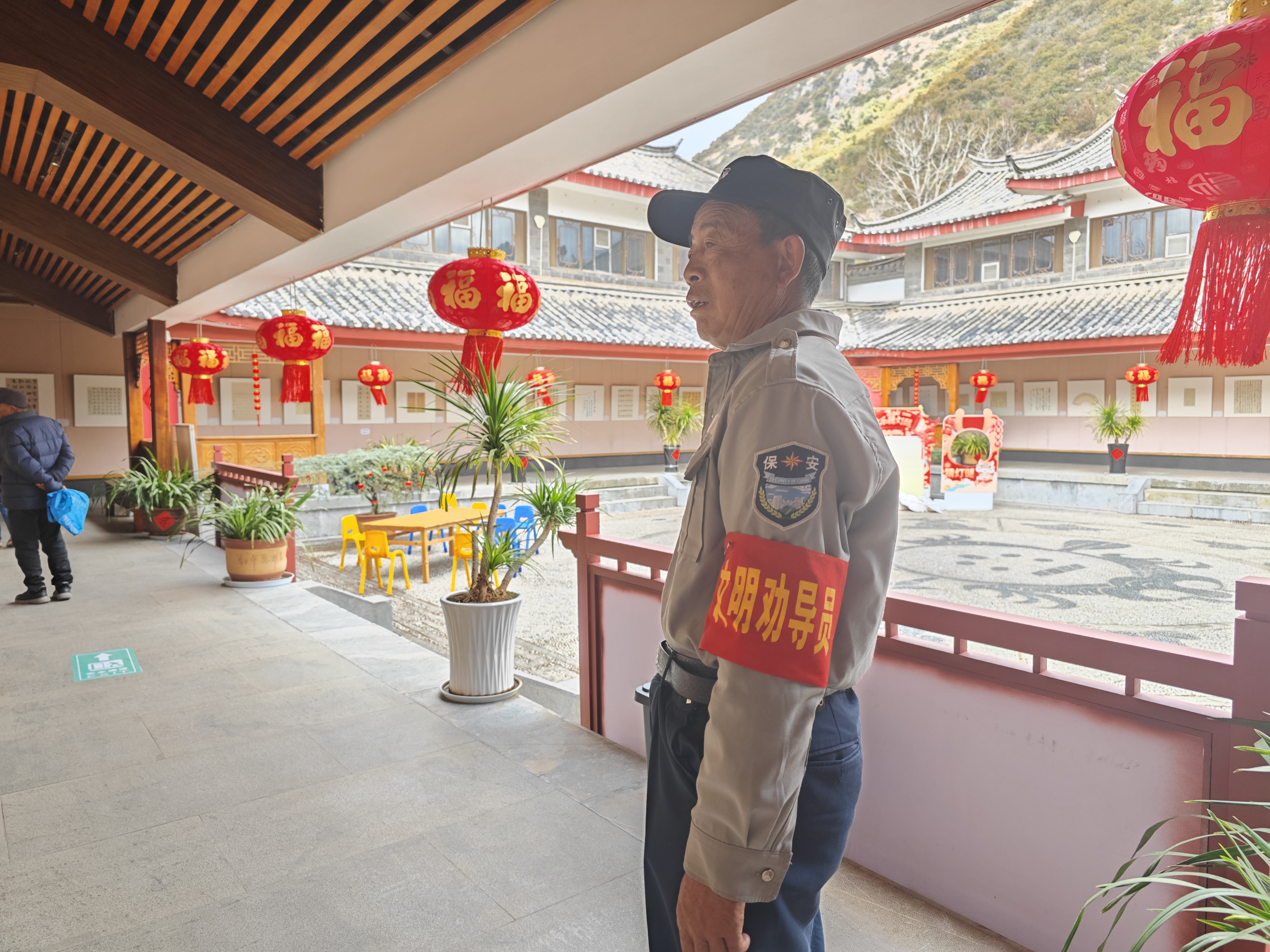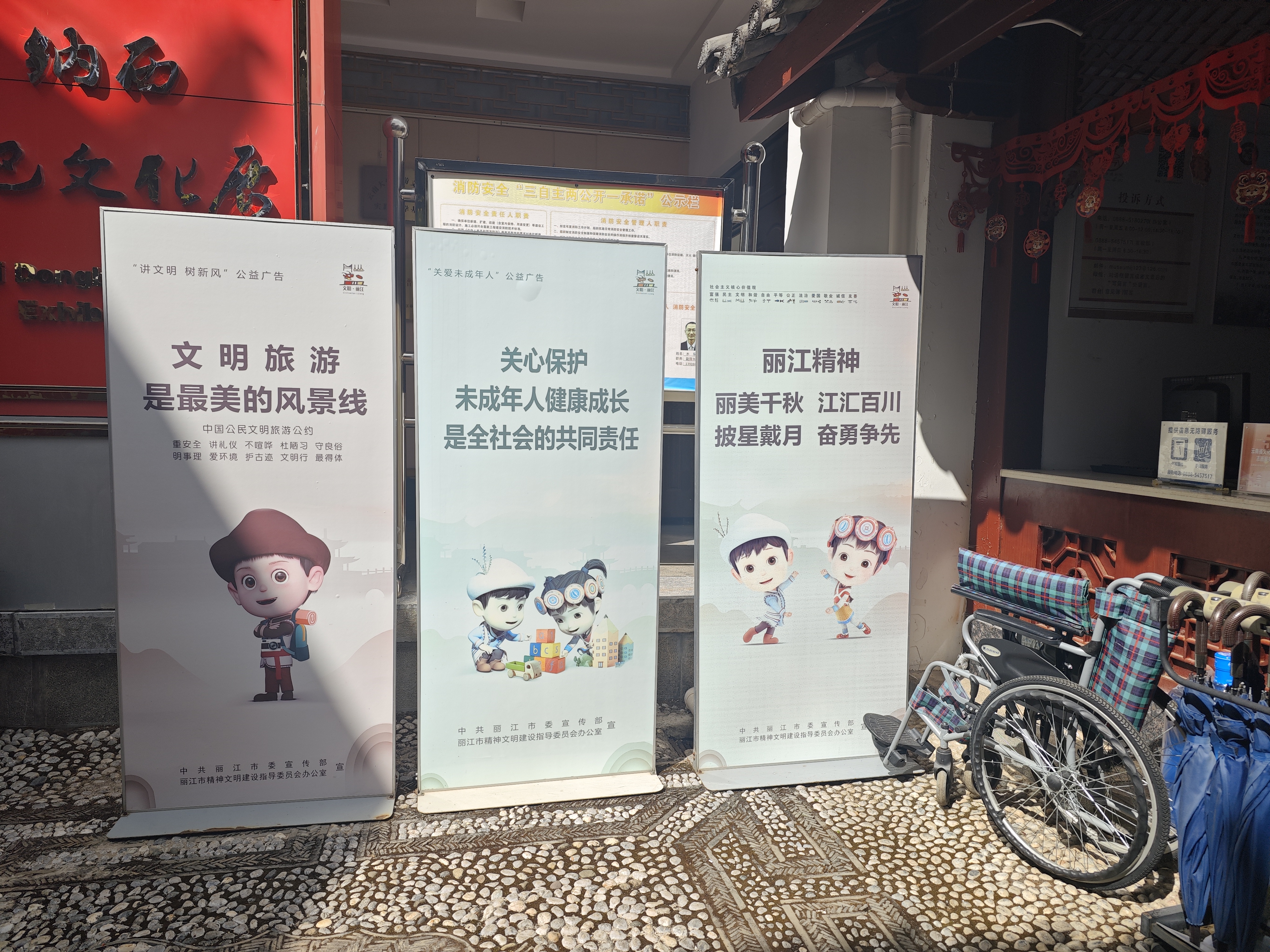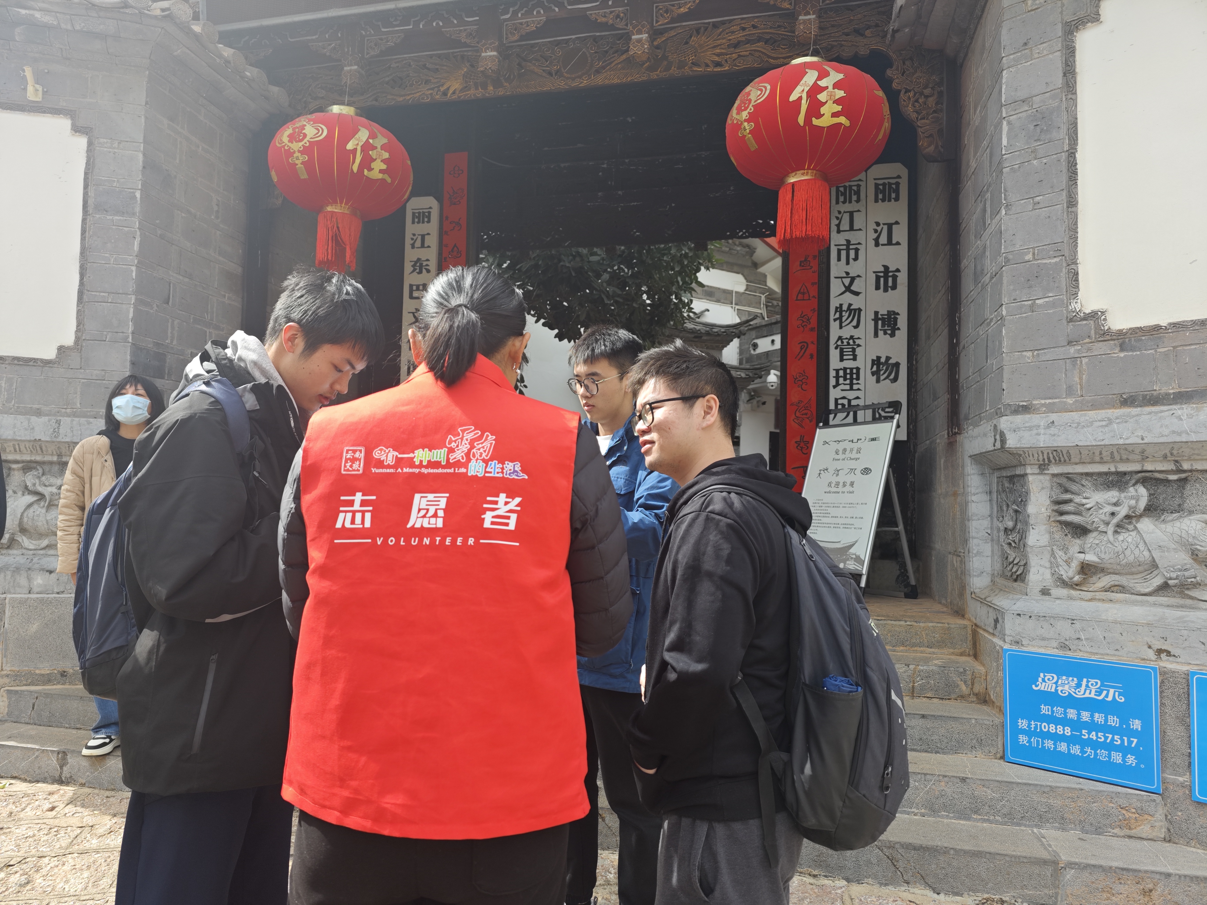 節(jié)假日、寒暑假,是博物院的人流高峰期,加上未成年人參觀者增多,喧嘩吵鬧,垃圾落地等不文明行為偶有發(fā)生。一個不經(jīng)意的不文明行為可能不會對本人造成什么影響,但一定會或多或少影響到其他人的參觀體驗。為了盡可能的防止不文明行為的出現(xiàn),麗江市博物院做了不少工作,比如在各個顯眼的地方張貼有文明標語、在館內(nèi)每個展廳內(nèi)安排有志愿者、文明勸導員、保潔員等。