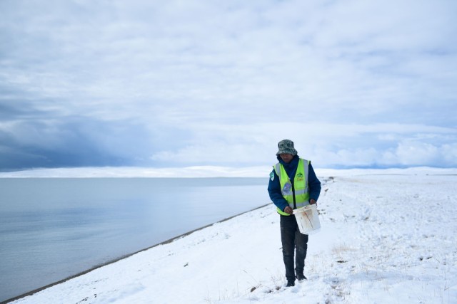 2021年10月20日,在青海省果洛藏族自治州瑪多縣扎陵湖鄉(xiāng)勒那村,三江源國(guó)家公園黃河源園區(qū)生態(tài)管護(hù)員在扎陵湖邊撿拾垃圾。新華社記者 張龍 攝