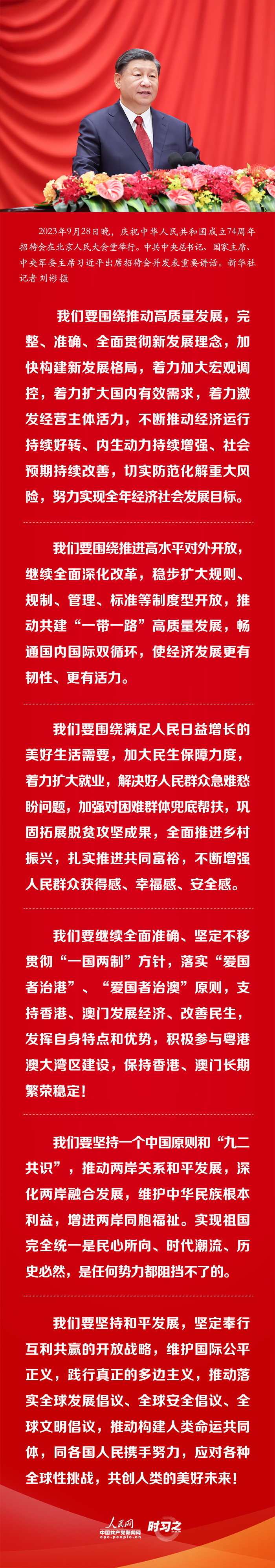 9月28日晚,慶祝中華人民共和國成立74周年招待會(huì)在人民大會(huì)堂舉行。中共中央總書記、國家主席、中央軍委主席習(xí)近平出席招待會(huì)并發(fā)表重要講話。他強(qiáng)調(diào),新征程上,我們的前途一片光明。團(tuán)結(jié)就是力量,信心賽過黃金。我們要堅(jiān)定信心,振奮精神,團(tuán)結(jié)奮斗,繼續(xù)爬坡過坎、攻堅(jiān)克難,堅(jiān)定不移朝著強(qiáng)國建設(shè)、民族復(fù)興的宏偉目標(biāo)奮勇前進(jìn)。