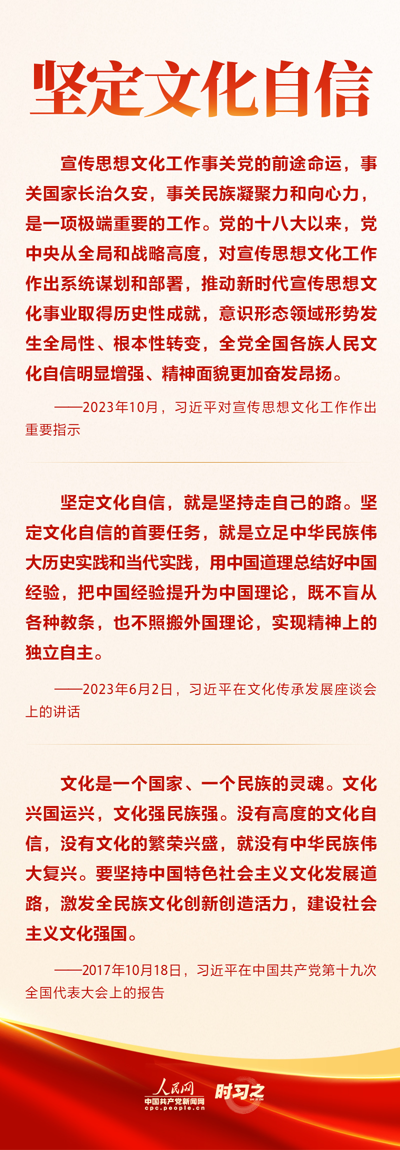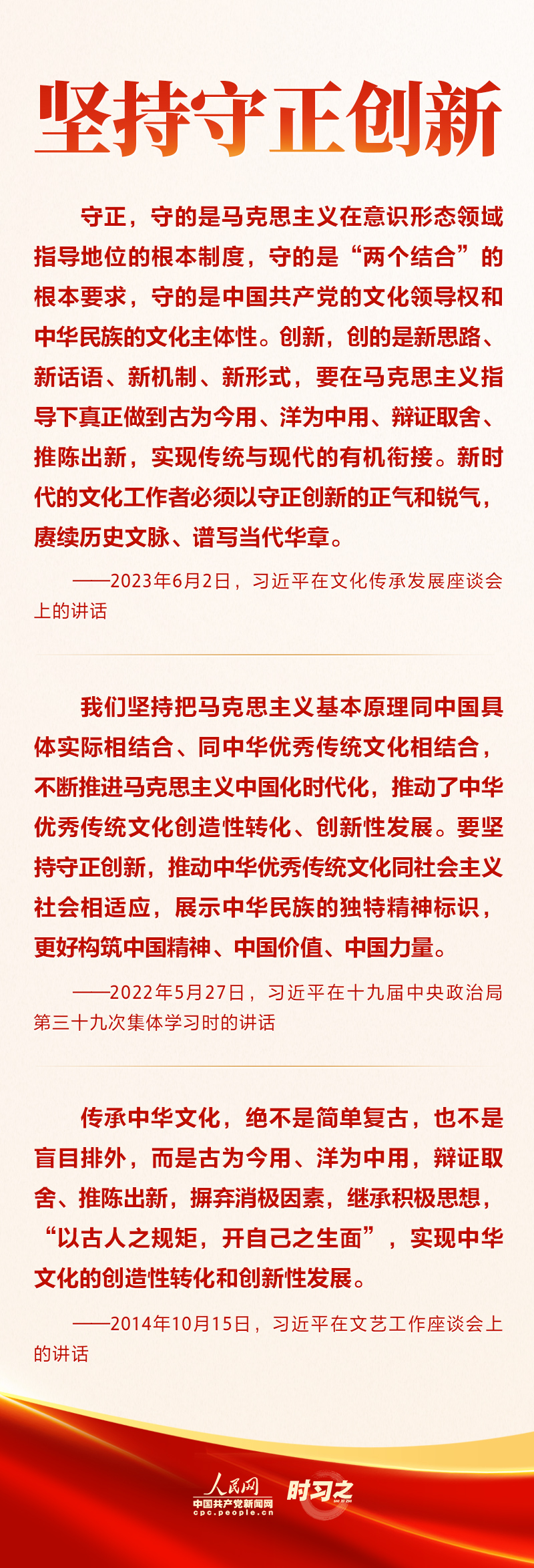 圍繞在新的歷史起點(diǎn)上繼續(xù)推動(dòng)文化繁榮、建設(shè)文化強(qiáng)國(guó)、建設(shè)中華民族現(xiàn)代文明這一新的文化使命,習(xí)近平總書記一以貫之強(qiáng)調(diào)要“堅(jiān)定文化自信”“秉持開(kāi)放包容”“堅(jiān)持守正創(chuàng)新”。