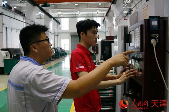 中國(天津)職業(yè)技能公共實(shí)訓(xùn)中心實(shí)訓(xùn)車間里,王傳龍(左一)正在輔導(dǎo)學(xué)員操作機(jī)床。 人民網(wǎng)記者 陶建攝