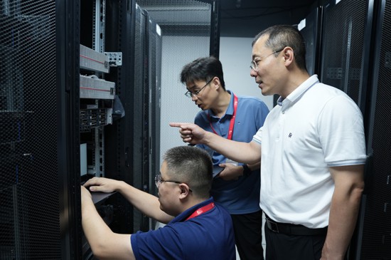 麒麟軟件有限公司機(jī)房內(nèi),孔金珠(右一)和同事在一起工作。 麒麟軟件有限公司供圖