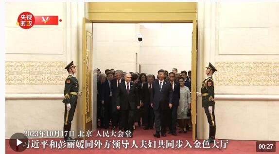 10月17日晚,國家主席習(xí)近平和夫人彭麗媛同外方領(lǐng)導(dǎo)人夫婦共同步入金色大廳,為來華出席第三屆“一帶一路”國際合作高峰論壇的國際貴賓舉行歡迎宴會。