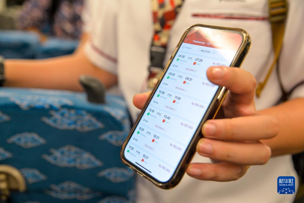 10月17日,一名乘客在行駛中的雅萬高鐵高速動(dòng)車組列車車廂內(nèi)展示雅萬高鐵購票手機(jī)應(yīng)用。新華社記者 徐欽 攝