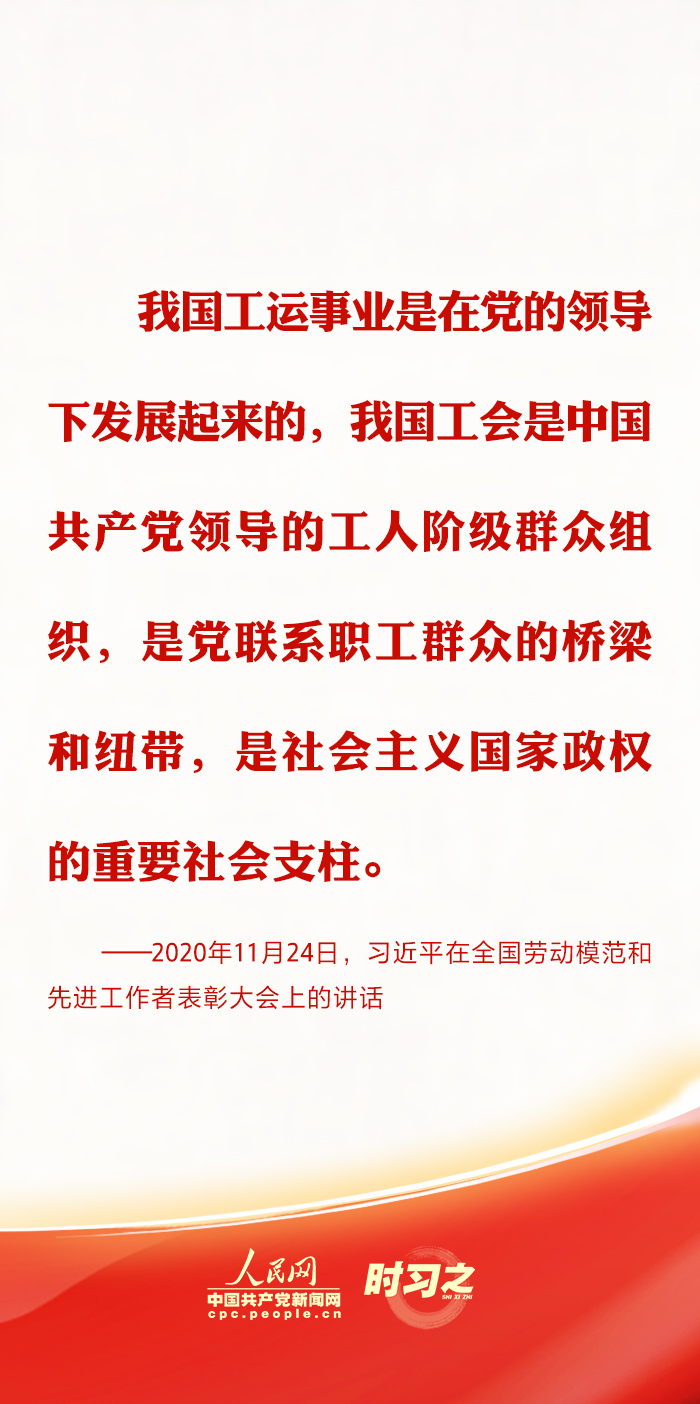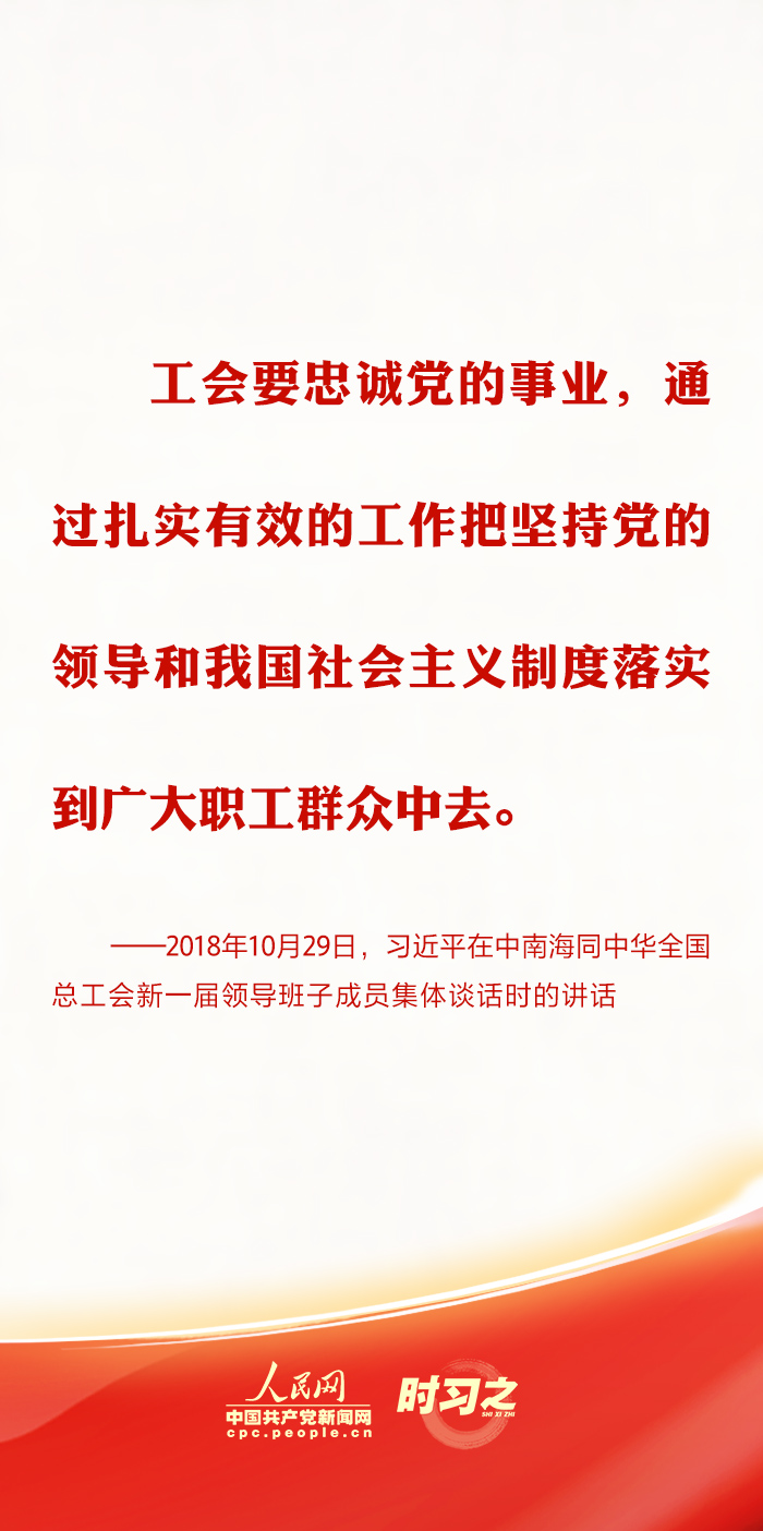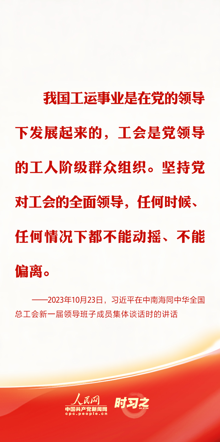 中共中央總書記、國(guó)家主席、中央軍委主席習(xí)近平10月23日下午在中南海同中華全國(guó)總工會(huì)新一屆領(lǐng)導(dǎo)班子成員集體談話并發(fā)表重要講話?!皥?jiān)持黨對(duì)工會(huì)的全面領(lǐng)導(dǎo),任何時(shí)候、任何情況下都不能動(dòng)搖、不能偏離?!绷?xí)近平總書記在多個(gè)場(chǎng)合強(qiáng)調(diào)加強(qiáng)思想政治引領(lǐng)的重要性,指引新時(shí)代工會(huì)工作蓬勃發(fā)展。