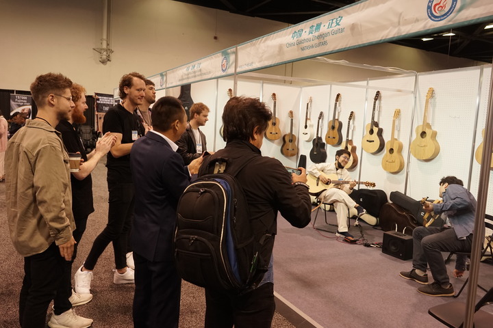 4月13日,在美國加利福尼亞州阿納海姆會(huì)展中心,參觀者在中國貴州正安吉他產(chǎn)業(yè)園一家公司展位觀看樂器表演。