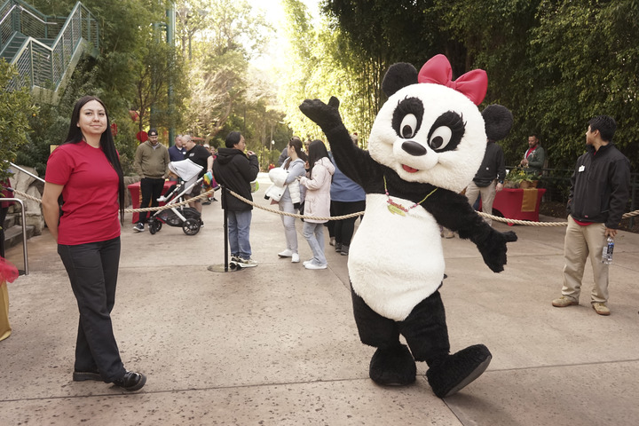 2月4日,在美國圣迭戈動(dòng)物園,一名裝扮成熊貓的工作人員在春節(jié)慶?;顒?dòng)上歡迎游客。