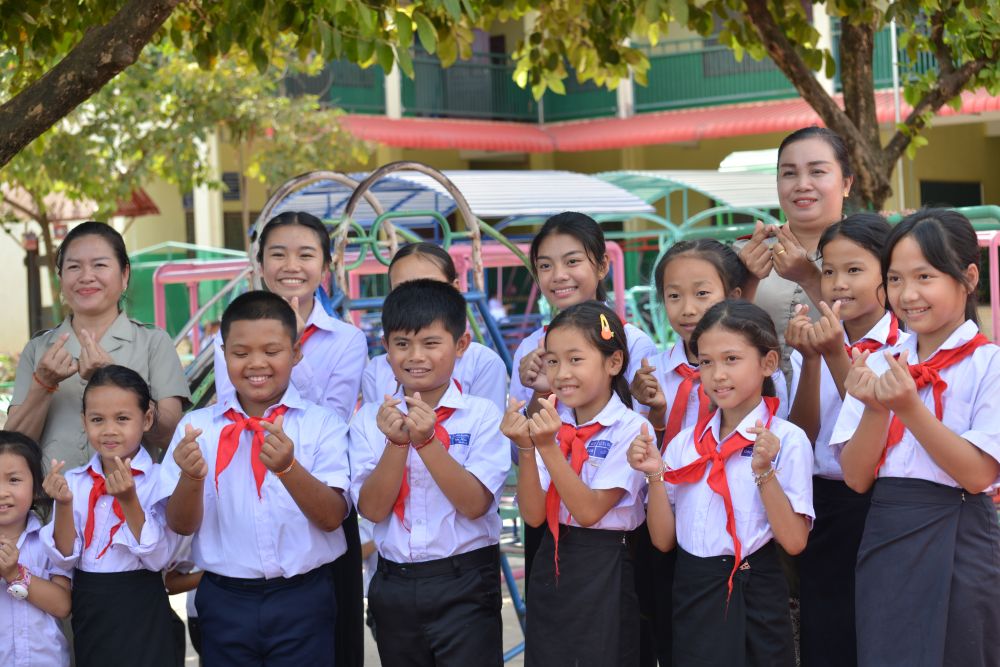在采訪中,中老友好農(nóng)冰村小學(xué)師生為老中友誼“比心”。