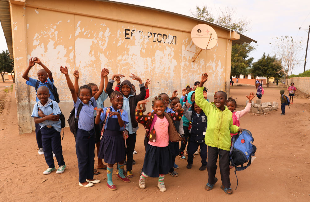 7月25日,莫桑比克馬普托省皮科科村學(xué)校的孩子們站在裝有中國援助的衛(wèi)星電視接收天線的房屋前。