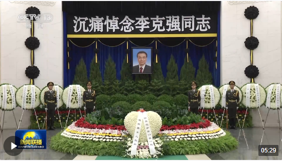 上午9時許,習(xí)近平和夫人彭麗媛,李強、趙樂際、王滬寧、蔡奇、丁薛祥、李希、韓正等,在哀樂聲中緩步來到李克強同志的遺體前肅立默哀,向李克強同志的遺體三鞠躬,并與李克強同志親屬一一握手,表示慰問。胡錦濤送花圈,對李克強同志逝世表示哀悼。