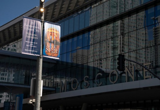 舊金山的亞太經(jīng)合組織會議場地外的宣傳海報。